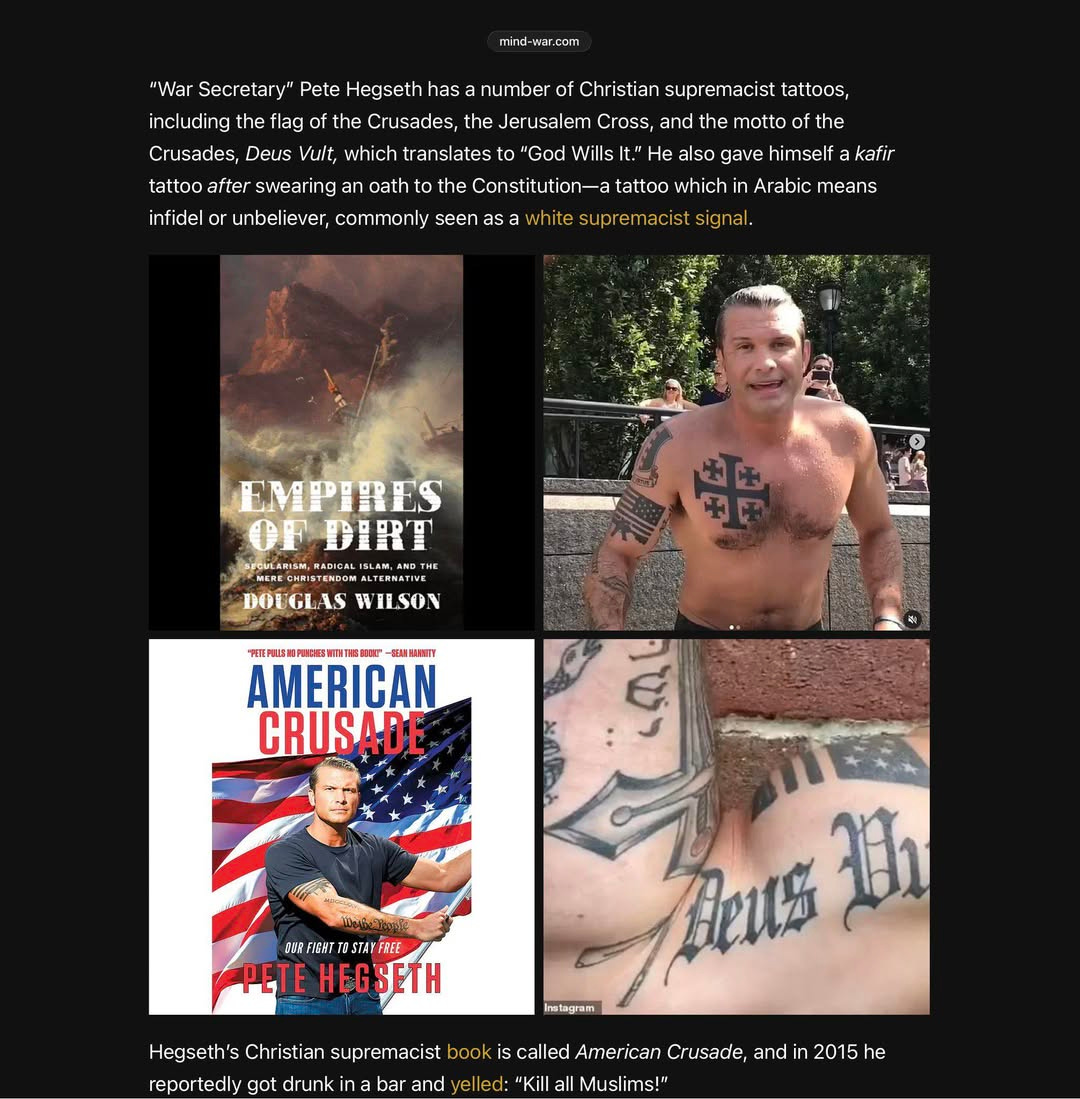 Next, we have Pete Hegseth talking to a group of Western leaders, with a partial transcript that describes his white Christian nationalist perspective. And note that Hegseth is the man known for drunkenly yelling “Kill all Muslims!” in a bar in 2015, and whose book “American Crusade” describes America’s “holy war” in defense of freedom, faith, and patriotism. As described here: