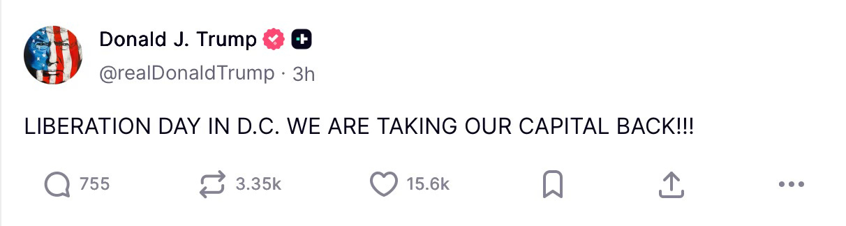 Trump has now federalized the police and is moving in the D.C. National Guard, which is essentially the same as federal troops. Trump didn’t call it martial law, but that’s basically what it is. That means the image I chose for that other piece was only too much because it featured tanks.